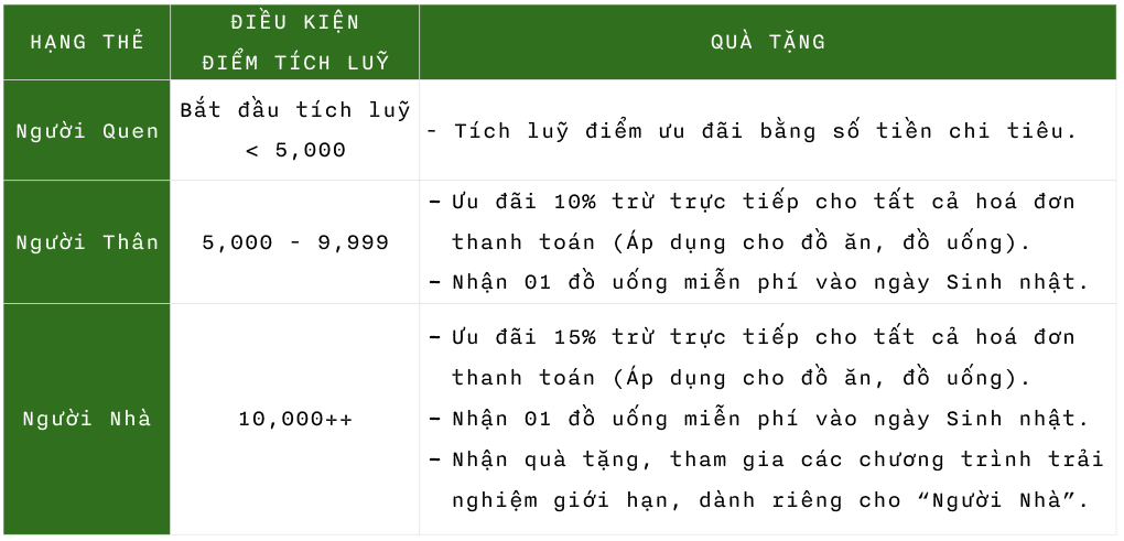 Thẻ Thân Thiết áp dụng tích điểm và đổi ưu đãi với 03 hạng thẻ: "Người Quen", "Người Thân" và "Người Nhà". Chi tiết như sau: